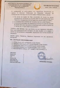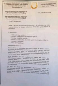Dans un communiqué rendu public ce lundi 16 février, l’administration scolaire annonce le renvoi immédiat de cinq élèves, impliquées dans des séquences filmées dans une concession familiale à la cité CBG. Ces vidéos, partagées sur les réseaux sociaux, présentent des mises en scène considérées comme incompatibles avec le règlement intérieur, le code de conduite scolaire et l’image de l’école guinéenne. Des vérifications et auditions ont confirmé leur implication directe.Les sanctions prononcées et les autorités ont décidé de :Renvoi immédiat de cinq élèves de tous les établissements scolaires de Guinée, du 16 février au 3 juillet 2026.Réinscription conditionnelle : toute reprise des études sera subordonnée à un engagement écrit signé par les deux parents.Remplacement intégral de l’encadrement du lycée N’Dama.Campagne nationale préventive : du 17 février au 17 mars 2026, lecture et explication obligatoires des règlements intérieurs dans toutes les écoles du pays.Les élèves concernées M’Mah Sylla (11ᵉ Littéraire, Lycée N’Dama)Mariama Cire Sylla (11ᵉ Scientifique, Lycée N’Dama)Djalikatou Sow (11ᵉ Scientifique, Lycée N’Dama)Mariama Soumah (11ᵉ Scientifique, Lycée N’Dama)Housseynatou Diallo (10ᵉ Année, Lycée Mohamed VI)Le Directeur préfectoral de l’Éducation, Ibrahima Fofana, a souligné le caractère éducatif de ces mesures. « Cette décision vise à rappeler aux élèves l’importance d’un comportement responsable, conforme aux normes sociales et aux exigences du système éducatif guinéen », a-t-il déclaré dans le communiqué officiel.