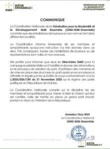 La Coordination rappelle que seuls les Directoires GMD chargés de la campagne présidentielle sont habilités à communiquer sur le processus de création du parti, l’adhésion des membres ainsi que la future mise en place de ses structures, et ce, uniquement après sa reconnaissance officielle par les autorités de la République de Guinée conformément à la loi L/2025/035/CNT du 21 novembre 2025 relative au régime des partis politiques.